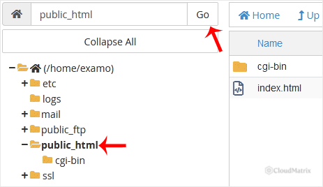 3. In cPanel File Manager, navigate to the directory where you want to upload your files to. For example, should you wish to upload your files to the public HTML directory, you must first go to /public_html. On the left side, in the list of directories, double click on the public_html directory.